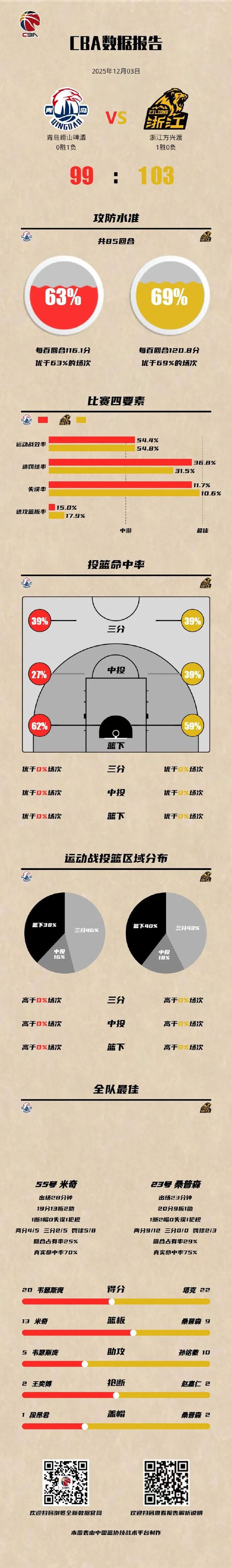 北京时间2025年12月3日,第二届中国人寿·CBA俱乐部杯小组赛拉开战幕,青岛崂山啤酒迎战劲敌浙江方兴渡。比赛开局,双方你来我往,第二节后半程青岛崂山啤酒团队协作、立足防守,连续得分,将比分反超。进入下半场,浙江方兴渡调整状态、保持领先,战到最后,青岛崂山啤酒追分未果,最终99-103遗憾输掉比赛。