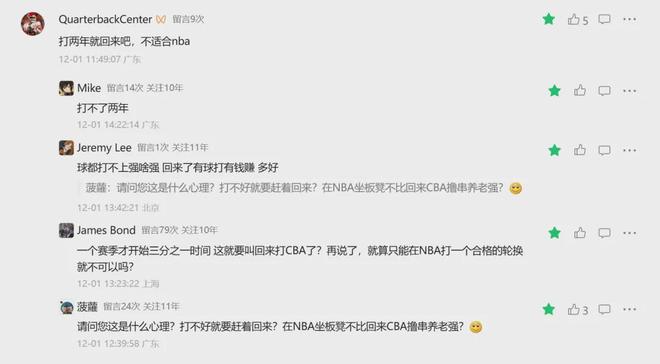他们顶着挺大的国内舆论压力,在外面一旦打不好,就要被喷“丢人”,就要被嚷嚷着“订机票吧”,“回来CBA吧”,“就是靠中国市场才出去的”。