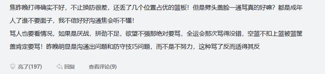 但话说回来,导致焦泊乔至今仍然无法适应广东队比赛节奏的关键,其实也跟他的心理素质不够硬有关,赛后广东球迷评论区,有球迷谈及了焦泊乔表现低迷的原因,除了身体状态没恢复到最佳外,可能还跟杜锋爱骂人的坏毛病有关,并且希望杜锋不要再骂他了。